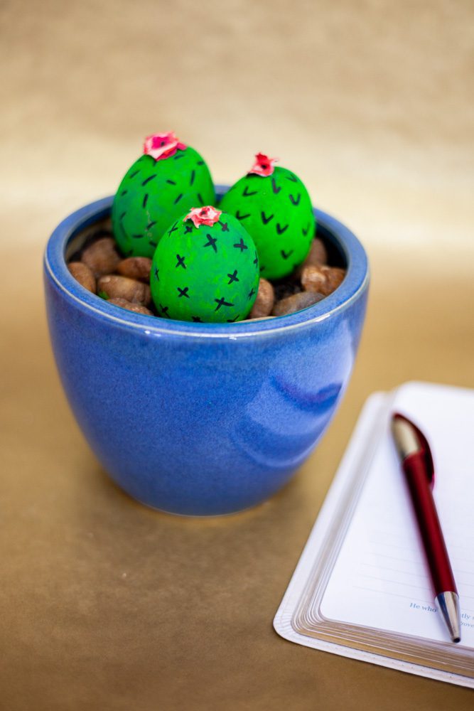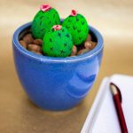 - Place egg-cacti in ceramic pot and arrange stones to keep the cactus-crafts in place.