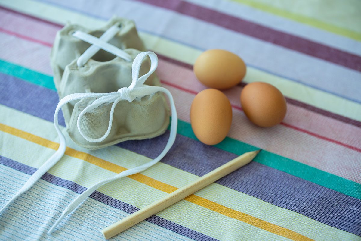 - Thread the shoelace through the holes in the egg carton like you would a shoe.