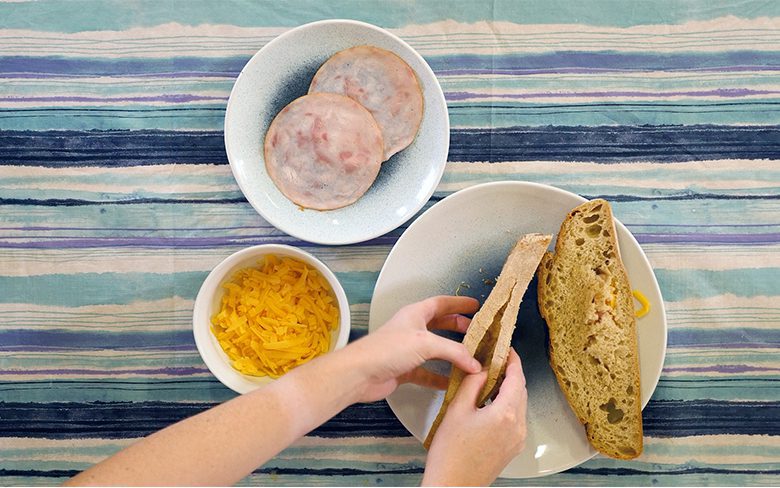 Cut an opening in both slices of bread, big enough to stuff the fillings into and fill with the ham and cheese.
